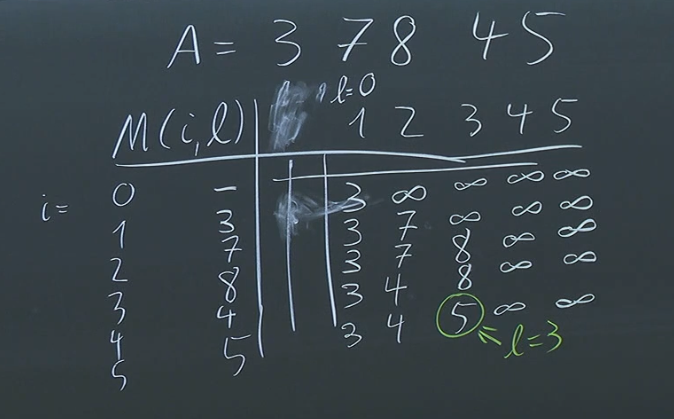 - The smallest ending value of an increasing subsequence of length considering only the elements . If no increasing subsequence of length exists using these elements, set .