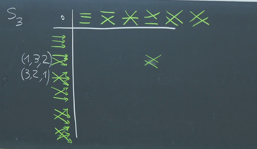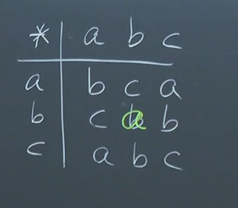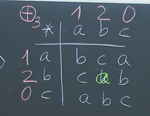 Here, corresponds to , to , and to . The operation becomes (addition modulo 3). For example:
