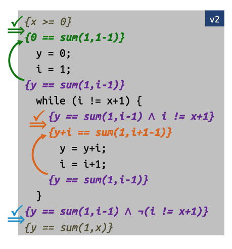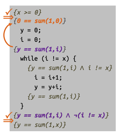{x > 0 ∧ y > 0} // Initialization (TBD) {inv: q * y + r == x} while (/* Condition (TBD) */) { r = r - y; // Decrease remainder q = q + 1; // Increment quotient } {q == x / y}Each iteration subtracts
