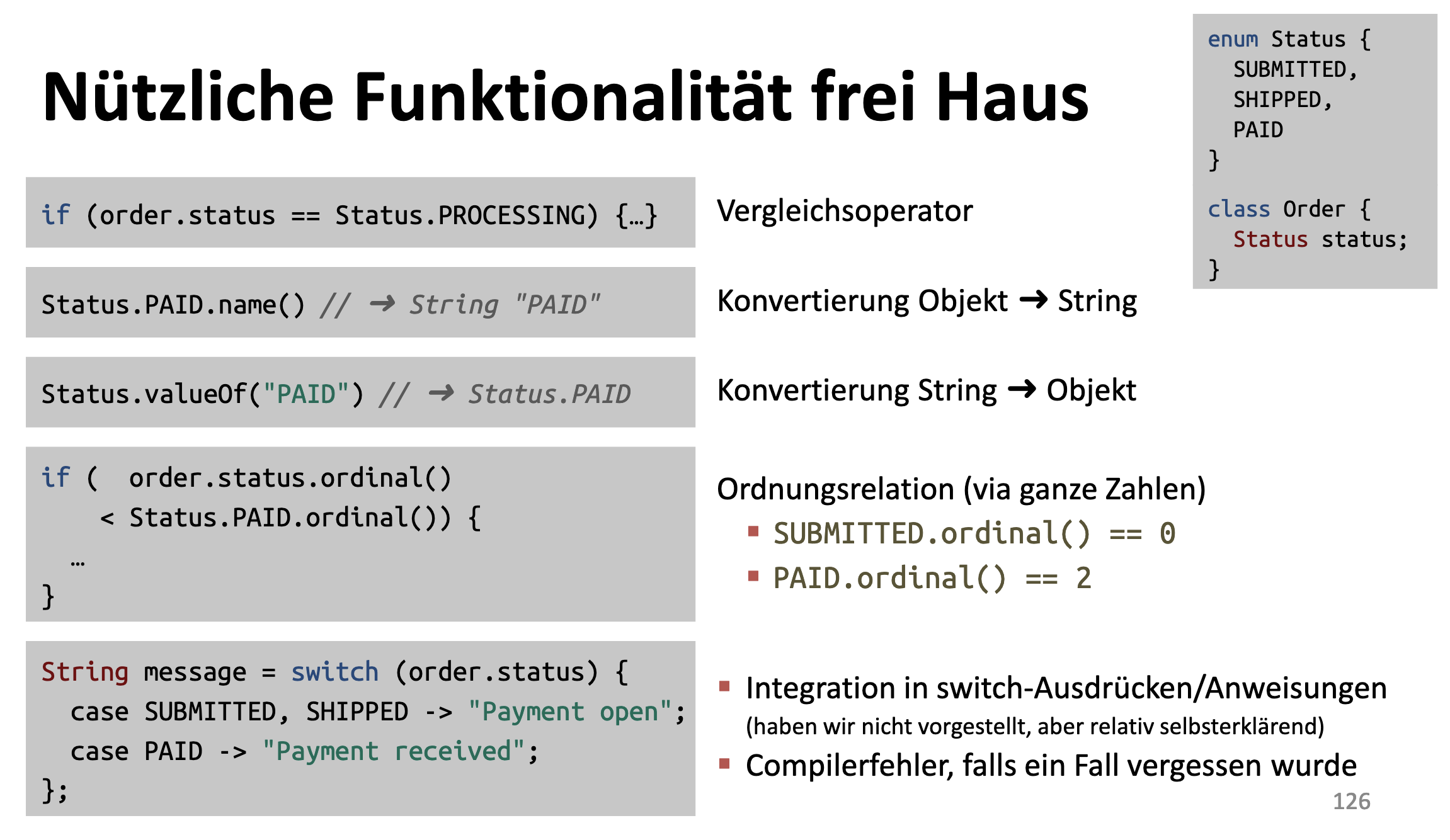 name(),valueOf(), andordinal(). They also integrate well withswitchstatements.