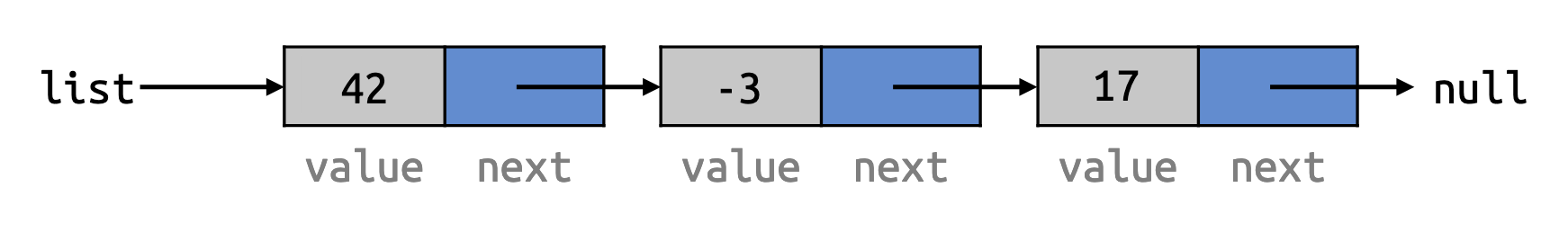 list -> [42 | next] -> [-3 | next] -> [17 | null]