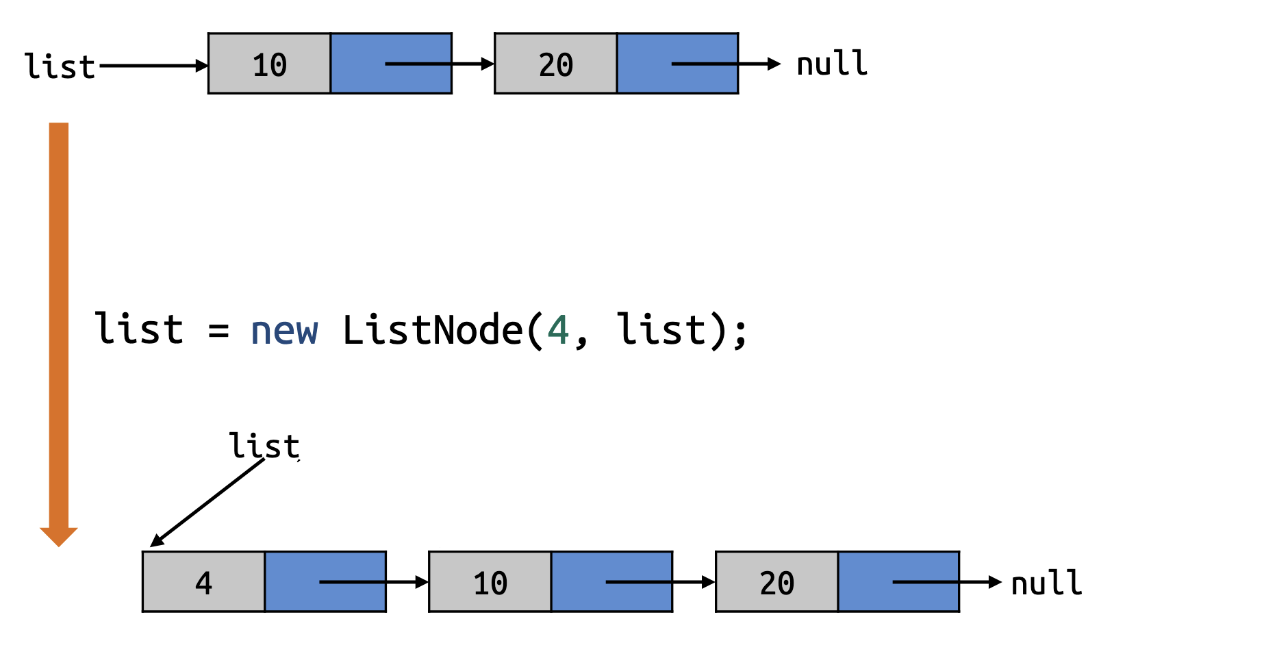 list = new ListNode(4, list); // Add 4 at the beginning3. Inserting in the Middle (or at a specific index)