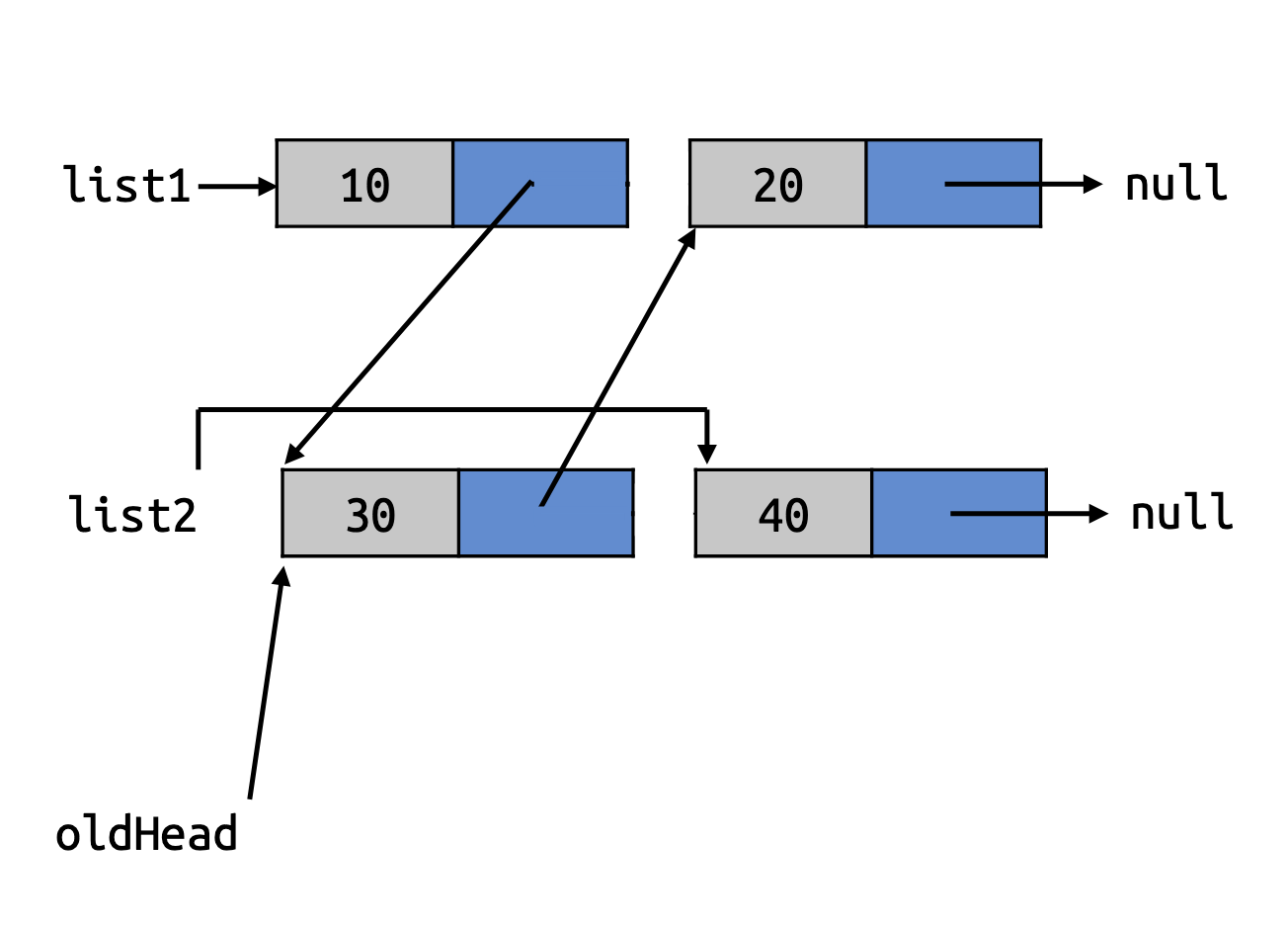 ListNode oldHead = list2; // Keep a reference to the 30 node