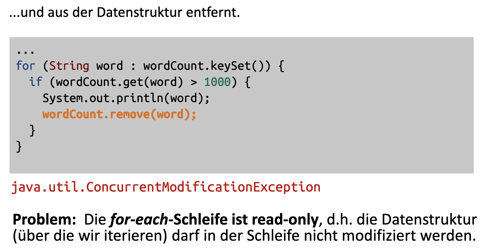 If you modify a collection directly (e.g. via .remove(element)) while iterating over it using an iterator, you will get a ConcurrentModificationException: