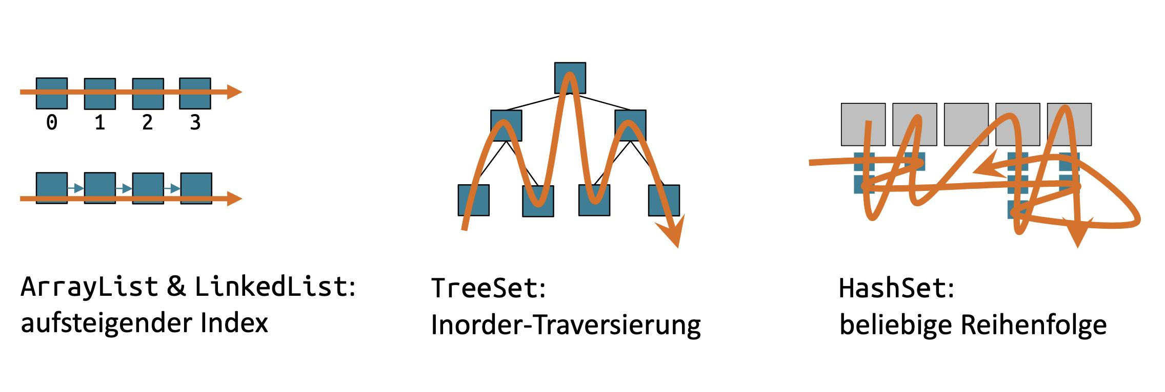 ArrayList,LinkedList: Iterates in the order of indices (0 to size-1).TreeSet: Iterates in the natural sorted order (according tocompareTo()).HashSet: Iteration order is not defined.