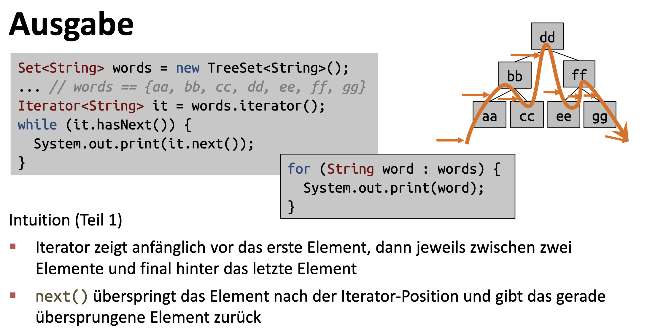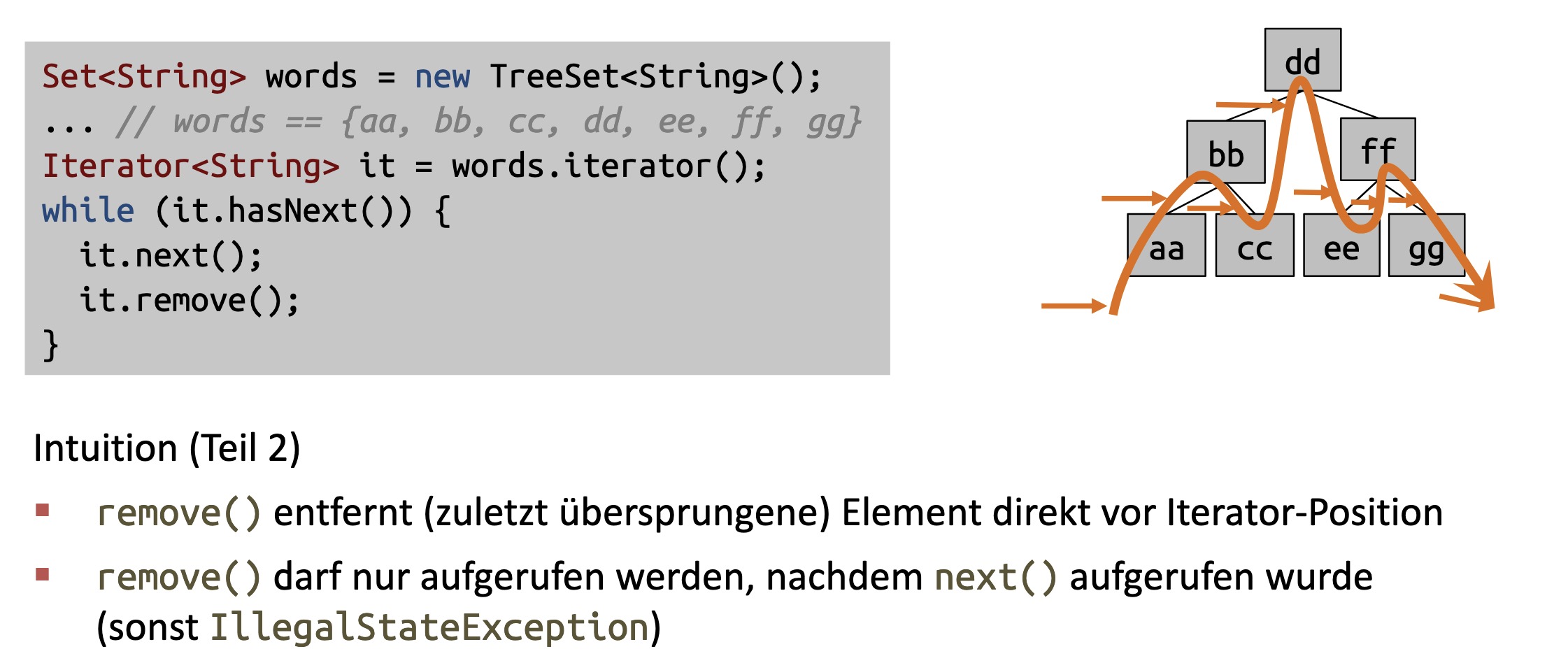 it.next() moves to the next position in the tree and removes the current element (the one we just passed through) if remove() is called. This is important because removing an element can modify the TreeSet. The direct removal of an element via .remove(element) will also rebalance the TreeSet, but this process is not shown in the slides.