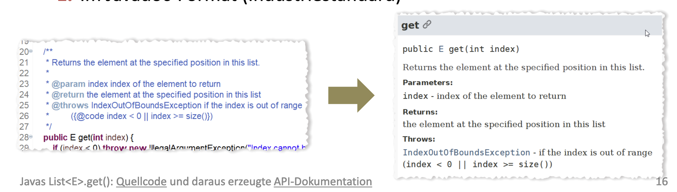 /** * Returns the element at the specified position in this list. * * @param index index of the element to return * @return the element at the specified position in this list * @throws IndexOutOfBoundsException if the index is out of range * (index < 0 || index >= size()) */ public E get(int index) { ... }Javadoc uses special tags like