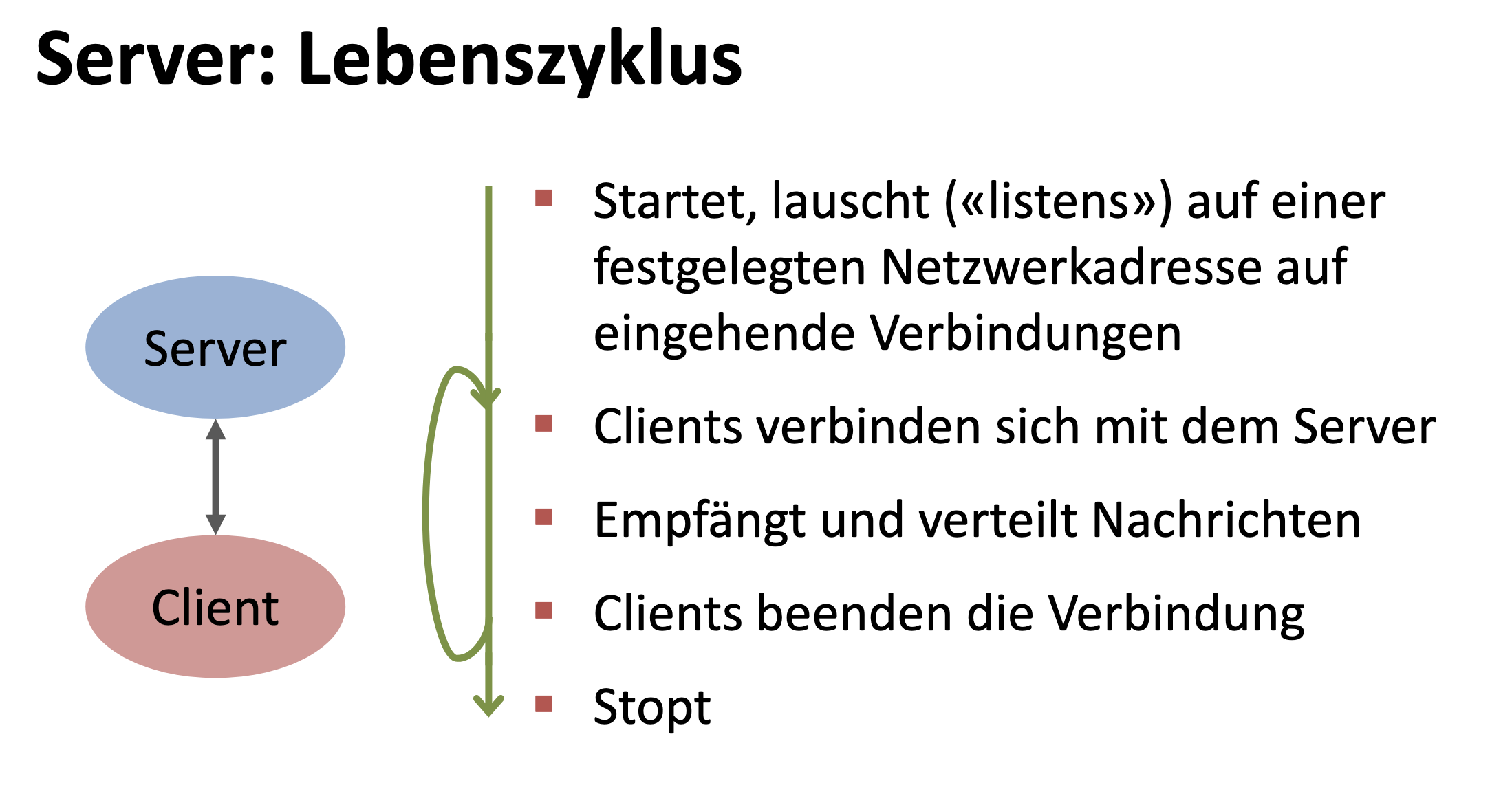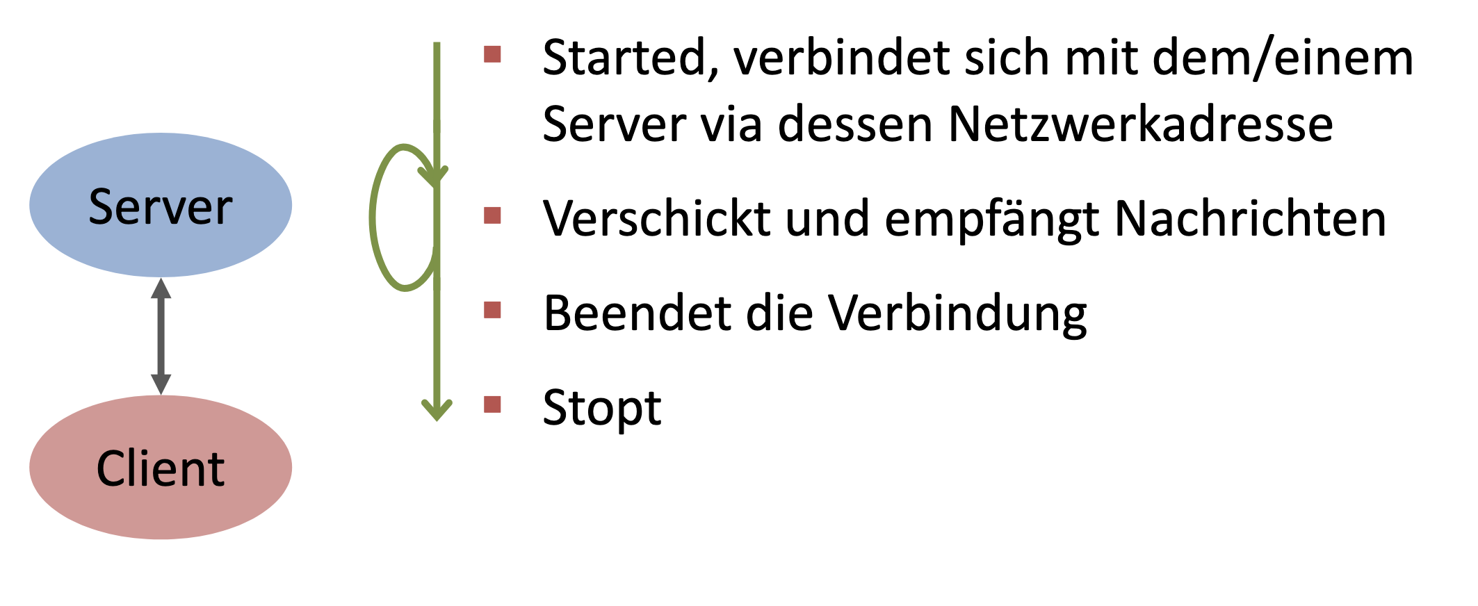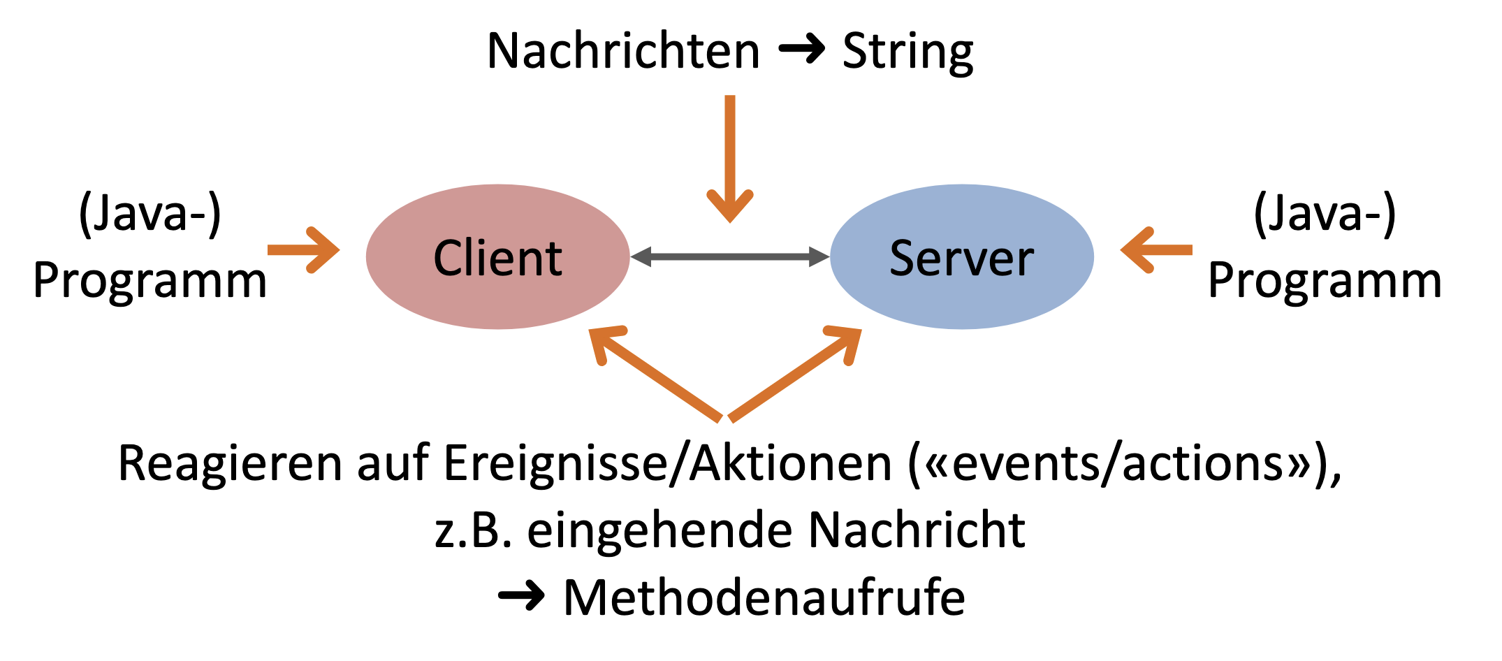 - Message Handling (Nachrichten): Uses (de)serialization to convert messages (objects) to strings and vice-versa for network transmission.