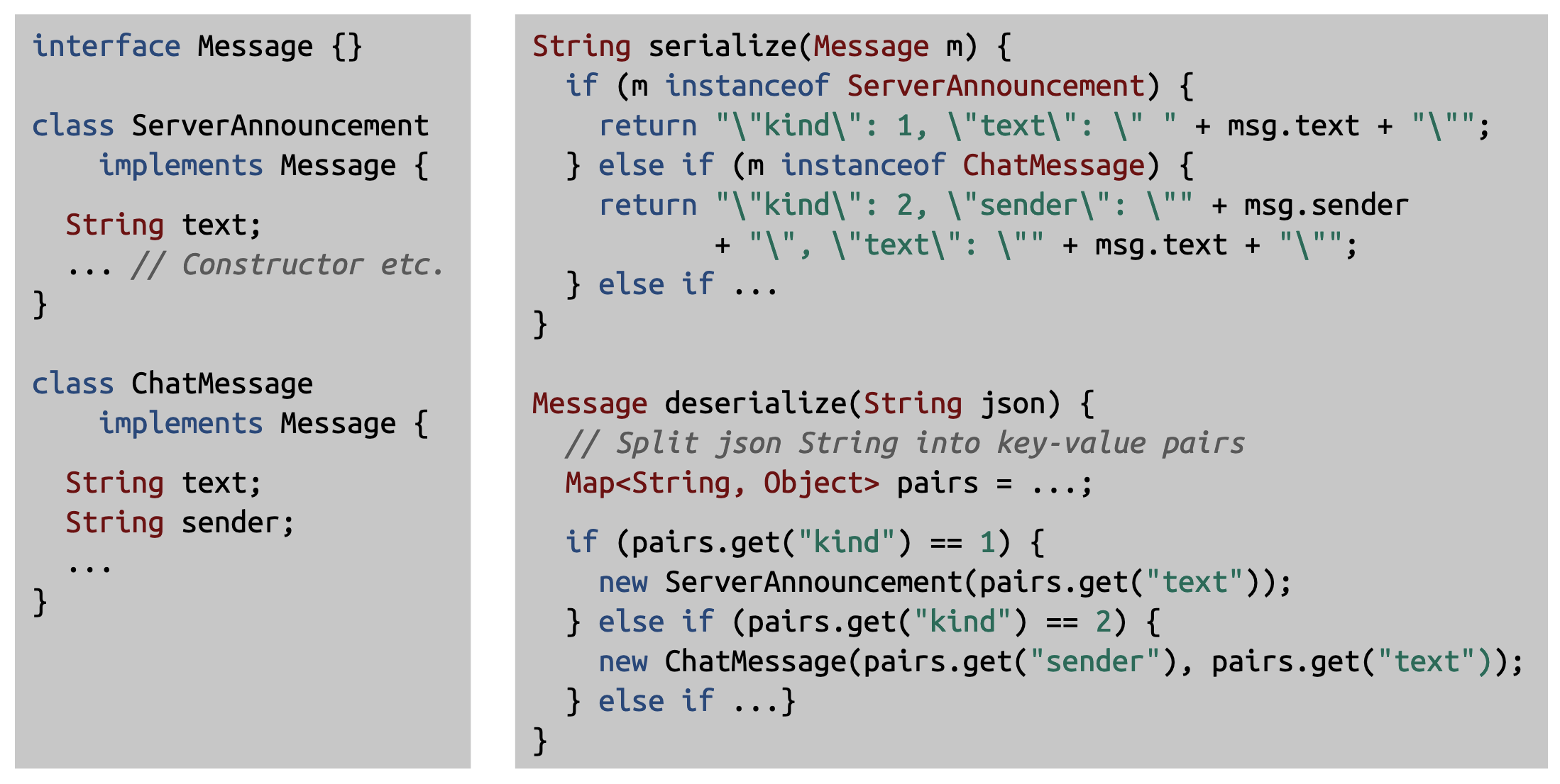 "kind": "ChatMessage"in JSON format) so that the appropriate object can be instantiated on deserialization. The string generated often utilizes JSON for easy transfer over networks.