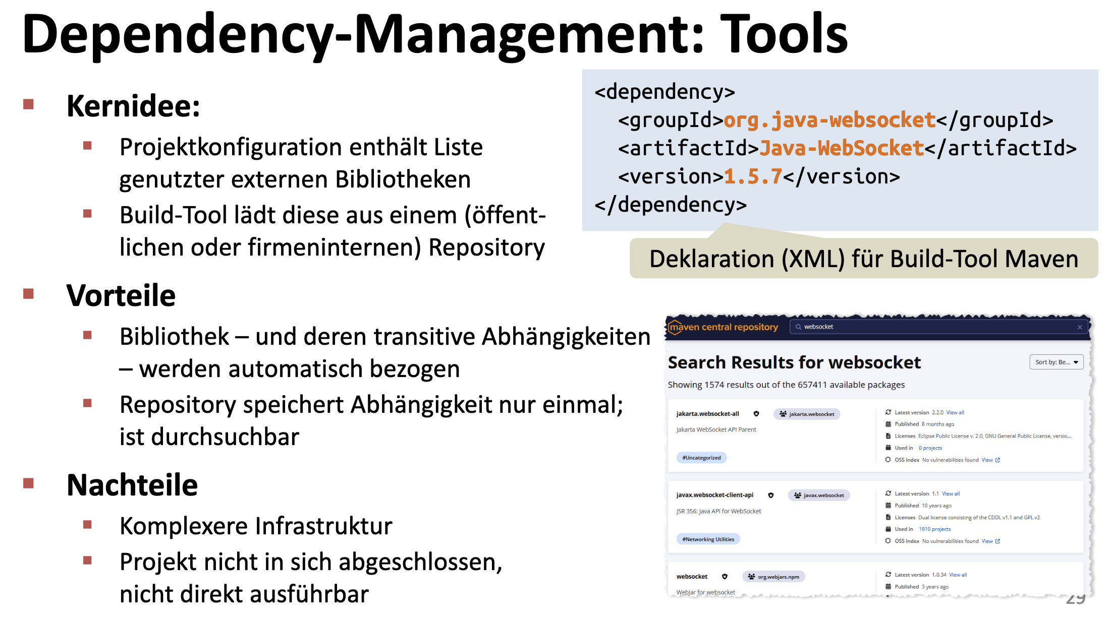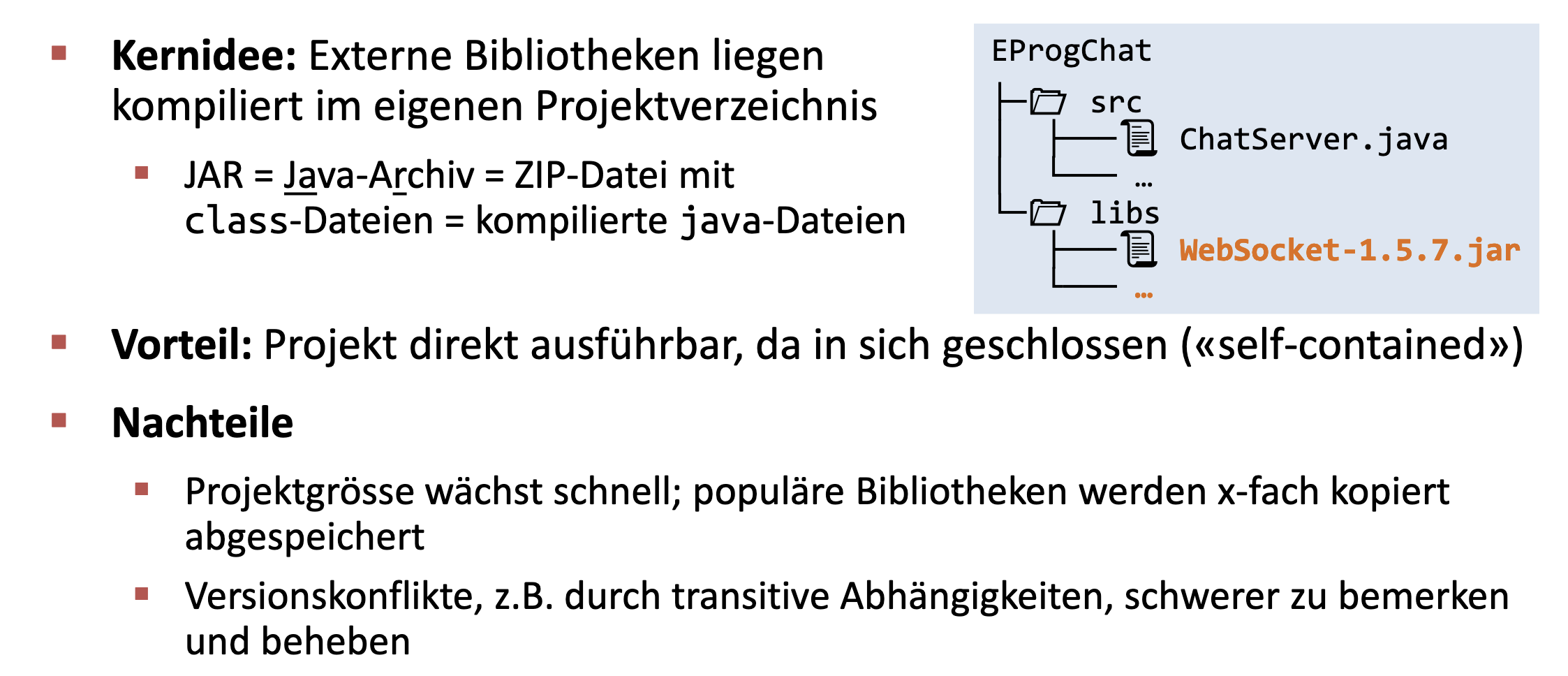 Modern projects often use dependency management tools like Maven, Gradle, or Ivy.