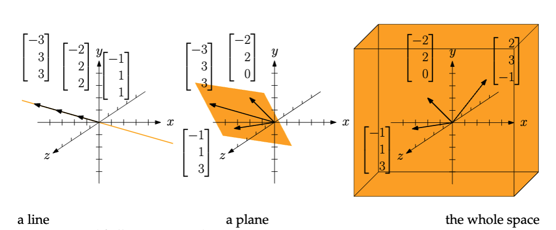 In other words, the span of a set of vectors is the collection of all vectors that can be formed by taking scalar multiples of each vector and adding them together.