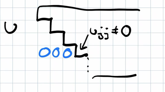 The part before is alright, cause it’s pivots are non-zero, but at our column we have a zero pivot. Now we need to show that the columns of this matrix are linearly dependent.