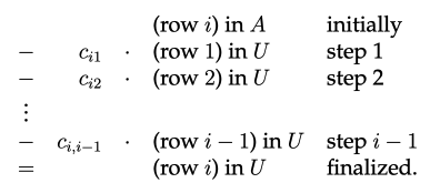 Focus on a single row: Consider a fixed row of . Whenever we change row , we subtract from it, for some previous row . At this point, row is “finalized” (meaning it has been transformed into its final form in ).