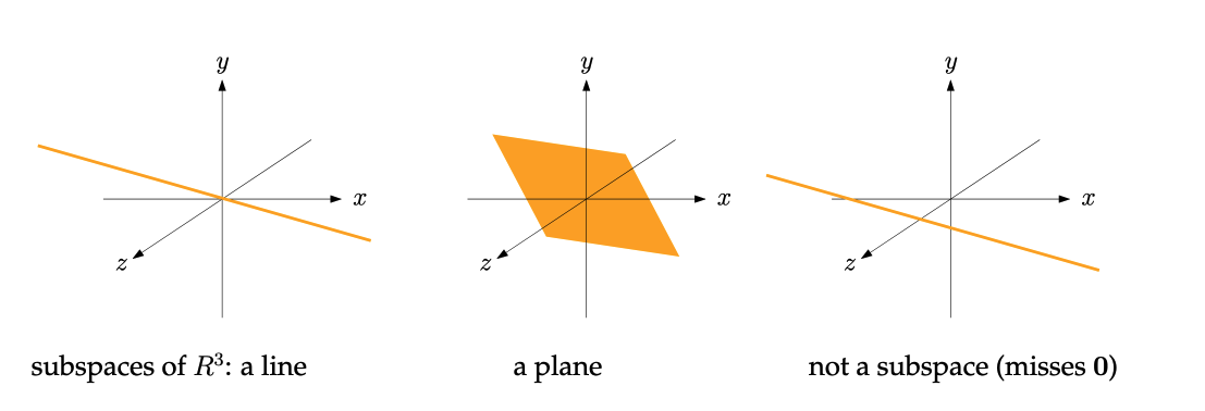 - Lines and Planes in : In three-dimensional space, lines and planes passing through the origin are subspaces. They are closed under vector addition and scalar multiplication, meaning that the sum of two vectors on the line/plane remains on the line/plane, and scaling a vector on the line/plane keeps it on the line/plane.