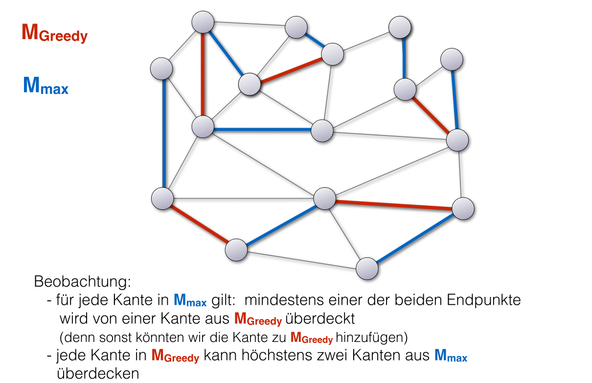 Justification: Consider any edge in the maximum matching . If we consider the edges in one by one, for each edge , either is added to or one of its endpoints, or , must have been covered by an edge already in . This is because if neither nor was covered when we considered , the greedy algorithm would have picked (or some edge that covers or at that point). Therefore, for every edge in , at least one of its endpoints is covered by an edge in . Since each edge in can cover at most two endpoints of edges in , we get the 2-approximation ratio.