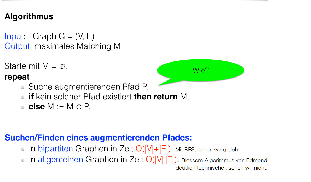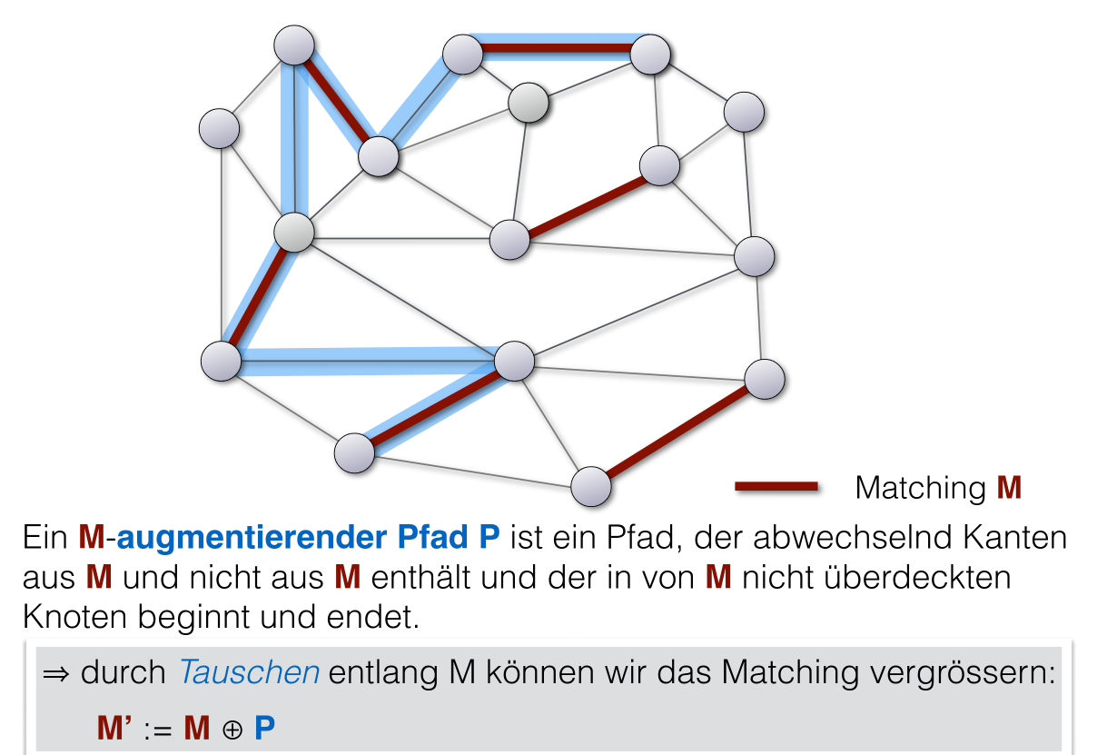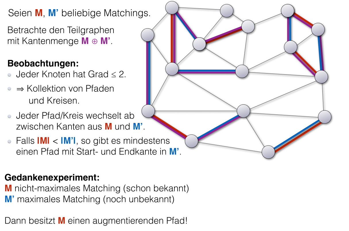 Theorem (Berge, 1957): A matching in a graph is a cardinality-maximal matching (maximum matching) if and only if there is no -augmenting path in .