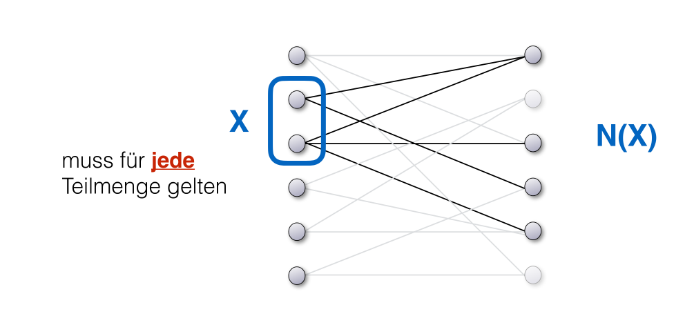 Let be a bipartite graph with bipartition . Hall’s condition states that for every subset of , the size of the neighborhood of , , must be at least as large as the size of :