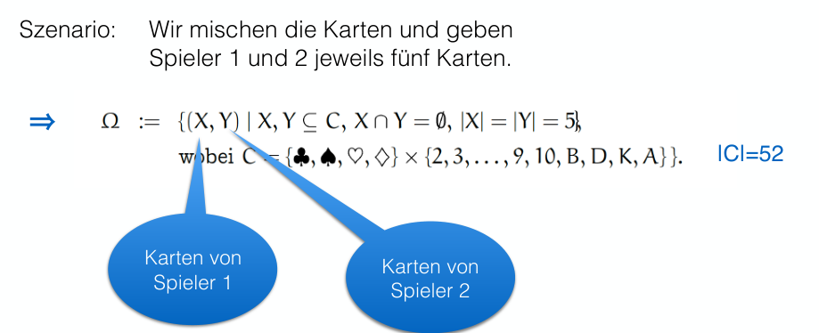 The sample space consists of all possible pairs of hands , where is Player 1’s 5-card hand and is Player 2’s 5-card hand, such that , , and .