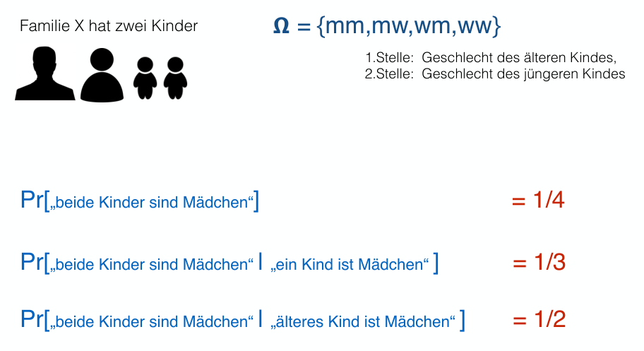 The subtle difference in information (“at least one is female” vs. “the older is female”) changes the resulting probability.