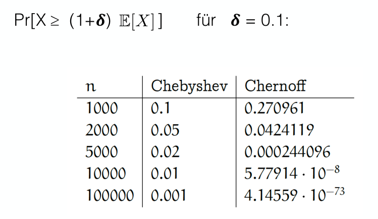 Interpretation: Chernoff decays exponentially in , giving much smaller probabilities for large deviations.