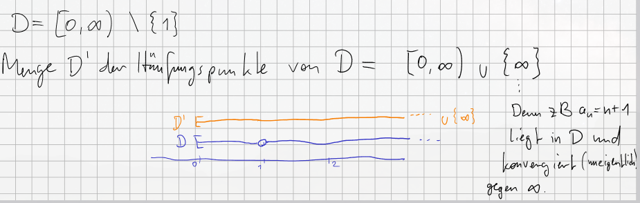 Example 2: Take . This is the non-negative real line with the single point removed. The accumulation points are the entire interval and . You can approach any non-negative real number (including and ) with points from . And, for instance, the sequence (for , so ) is in and heads off to .