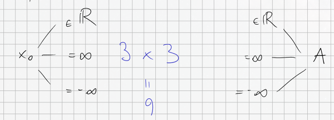 The Big Picture: There are possible scenarios for limits: can be finite, , or , and independently, the limit can also be finite, , or . Each has its own precise (or similar) formulation.