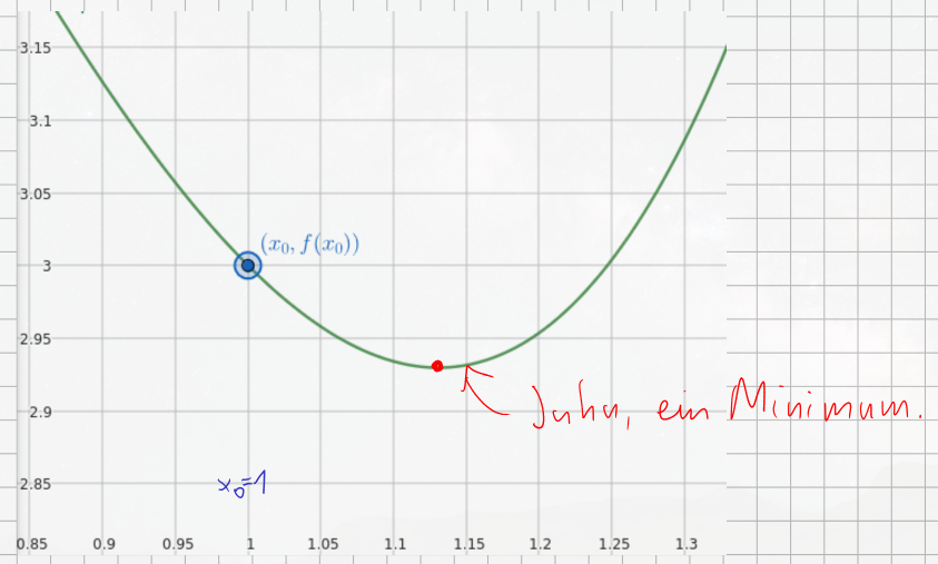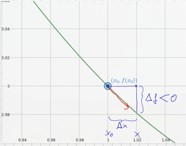 - Answer: The graph suggests that moving to the right might lead us towards a minimum, because the function is decreasing in the immediate vicinity to the right of (since for a positive ). (This is a baby example of an idea called Gradient Descent.)