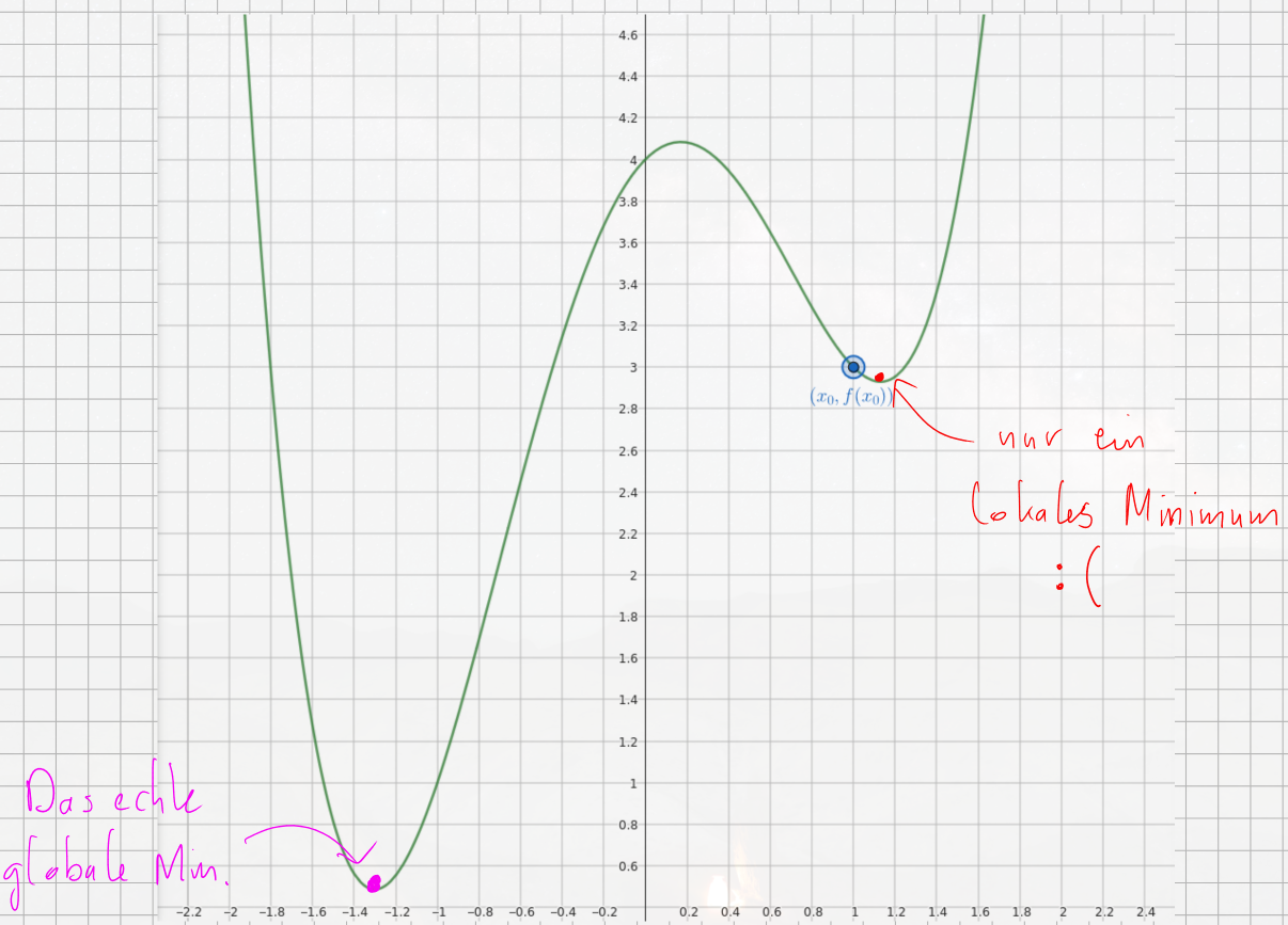 It seems our initial step to the right from led us to a minimum, but maybe not the overall (global) minimum.