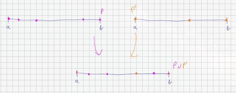 Remark: Any two partitions of always possess a common refinement, for example, their union . This common refinement contains all the points from both and .