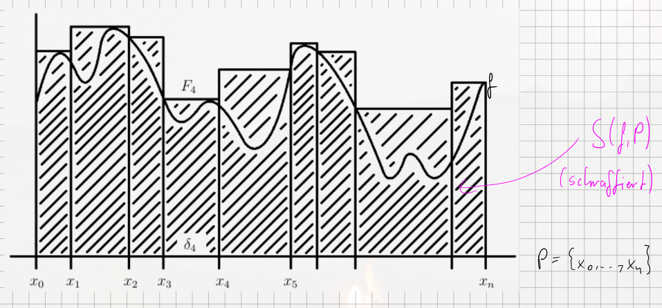 - Upper Darboux Sum (): Use as the height of a rectangle on the -th slice. The sum of these “over-rectangles” gives an overestimate.