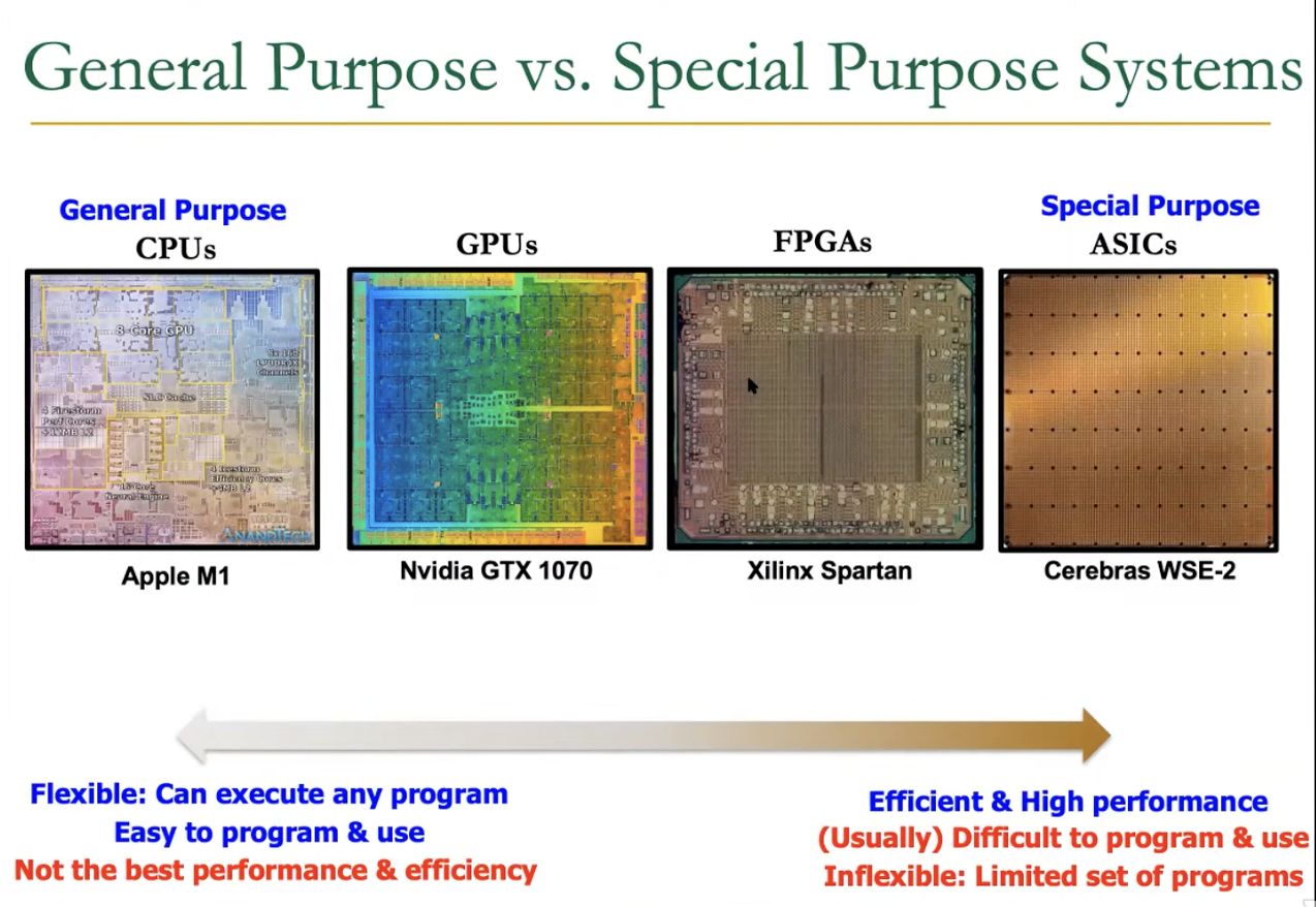 The spectrum of computer systems ranges from general-purpose CPUs to specialized ASICs (Application-Specific Integrated Circuits), with GPUs (Graphics Processing Units) and FPGAs (Field-Programmable Gate Arrays) occupying intermediate positions.