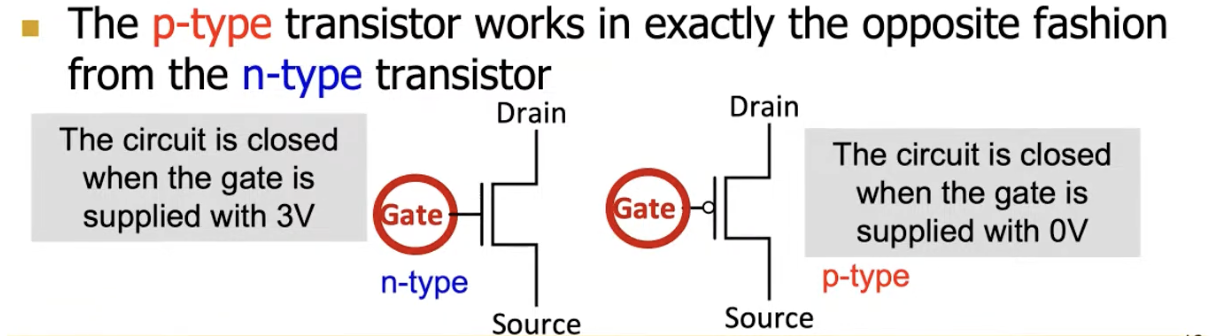 A pMOS transistor operates in the opposite manner. It conducts when a sufficiently low voltage is applied to its gate terminal. When the gate voltage is high, the transistor is non-conducting.