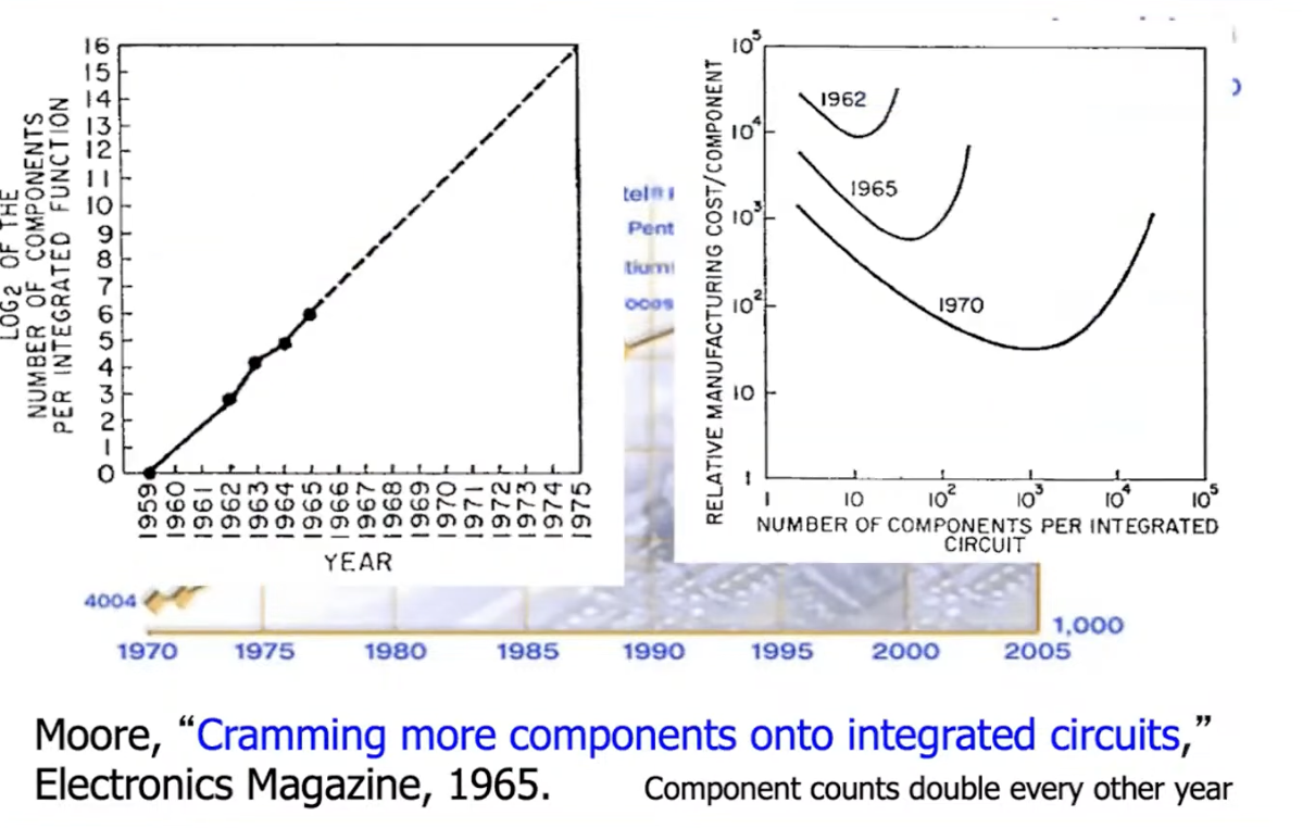 Moore’s Law, an observation made by Gordon Moore in 1965, predicted that the number of transistors on a microchip would double approximately every two years (or sometimes cited as 18 months), leading to exponential increases in computing power and decreases in cost.