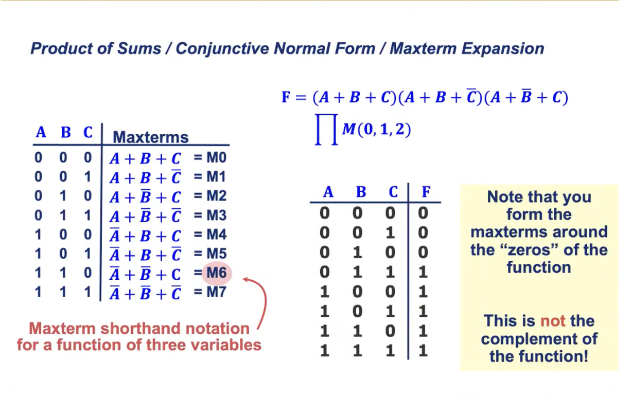 - Identify Maxterms: For each row in the truth table where the output is 0, create a maxterm by ORing together the literals corresponding to that row. If an input variable is 0 in that row, use the variable itself; if it’s 1, use its complement.
