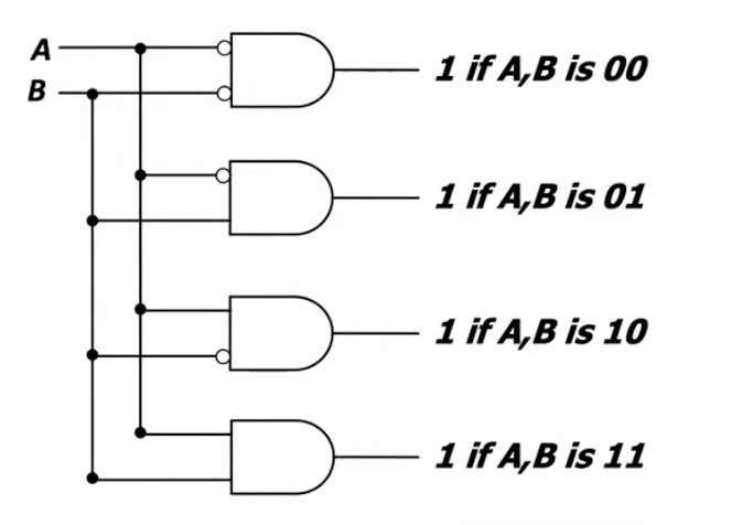 This construction ensures that for any given input combination, only one AND gate’s output will be 1, and all others will be 0. Each output represents a specific minterm corresponding to the binary input.