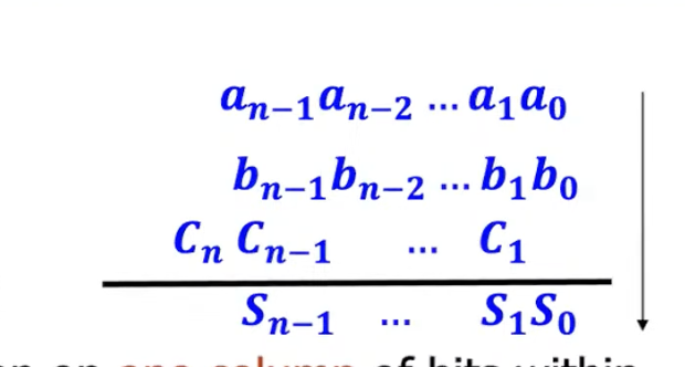 Binary addition is analogous to decimal addition, proceeding from right to left, processing one column at a time, generating a sum and a carry bit for each column.