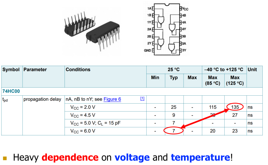 - Datasheet example showing how propagation delay () varies with supply voltage and temperature for a 74HC00 NAND gate.