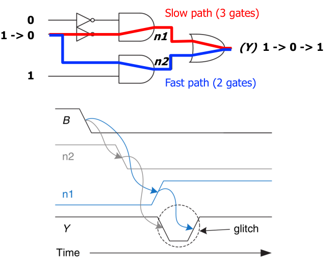 Circuit Example: AND-OR-NOT gate configuration showing how a single input transition can cause a glitch due to different path delays.
