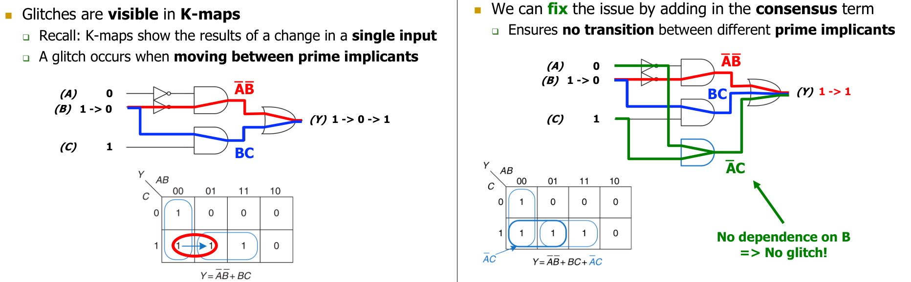 - Adding a consensus term can fix glitches by ensuring no transition between different prime implicants.