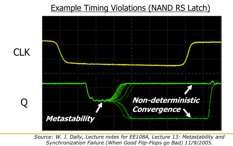 - Flip-flop output gets stuck somewhere between ‘1’ and ‘0’.