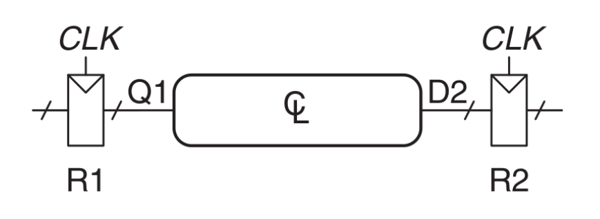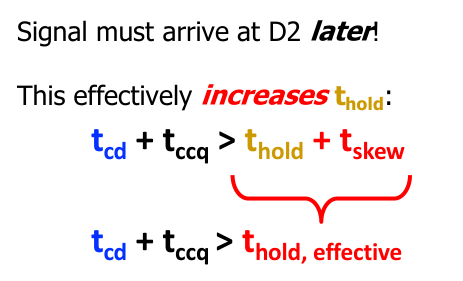 - Clock arrives at R2 after R1, increasing the minimum required delay for combinational logic.
