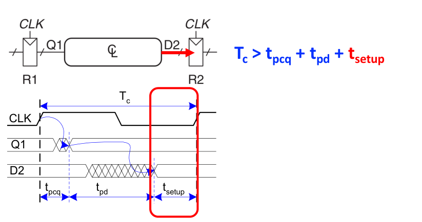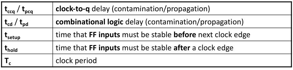 - Propagation delay clock-to-q (): Latest time after the clock edge that Q stops changing (stable).