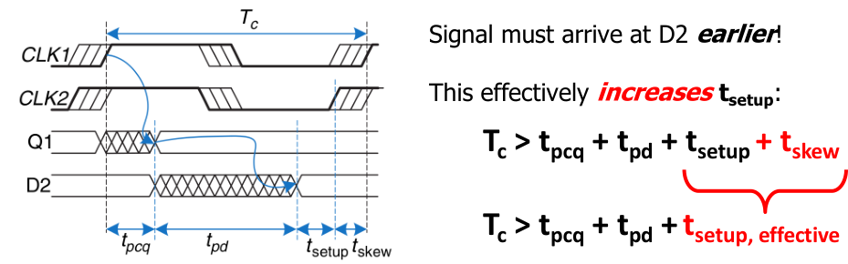 - Clock arrives at R2 before R1, leaving less time for combinational logic.