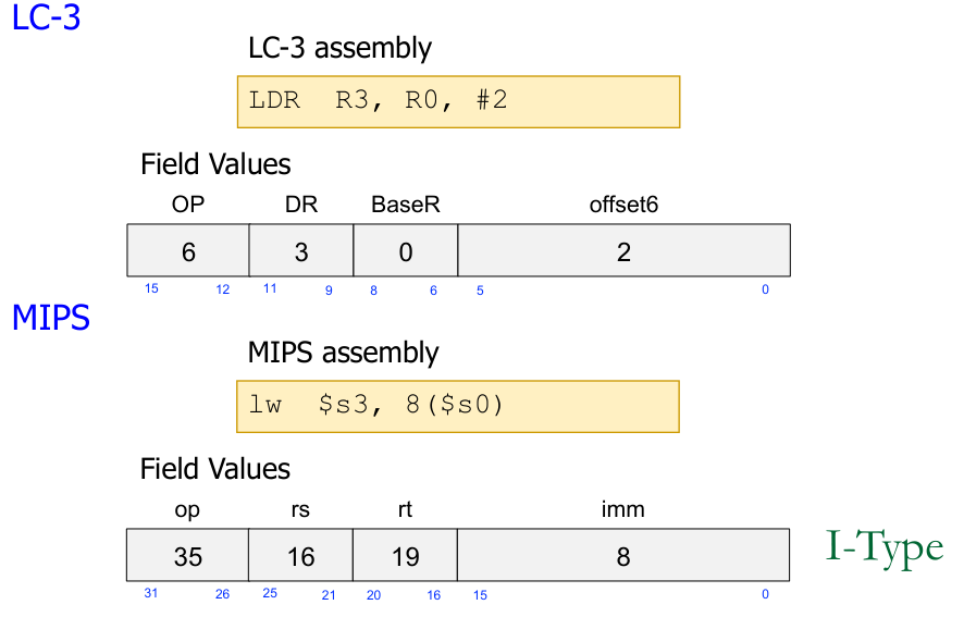 - LC-3 (LDR): Instruction format includes fields for Opcode, Destination Register (DR), Base Register (BaseR), and a 6-bit offset (