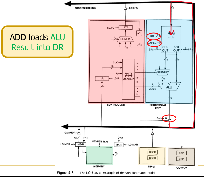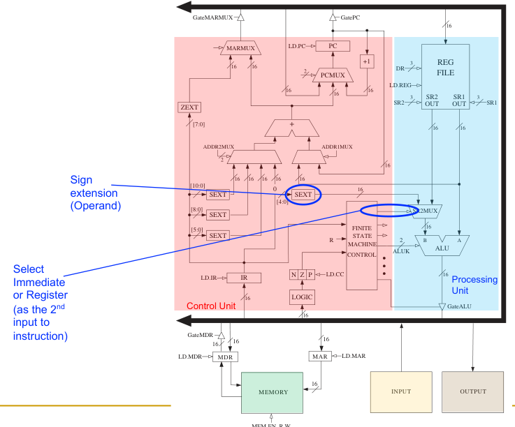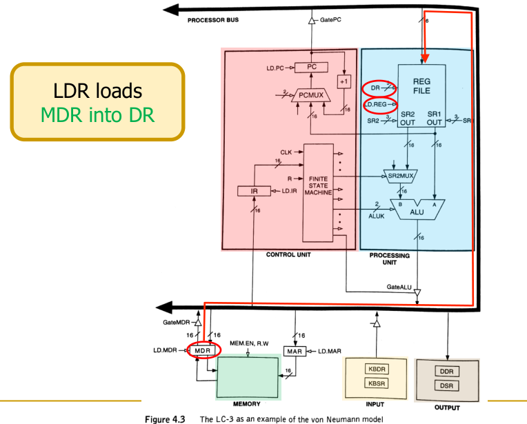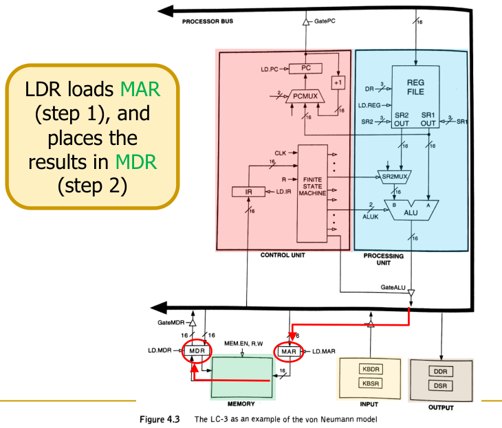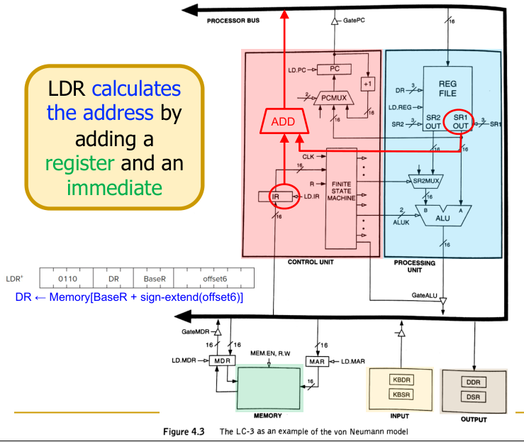 LDR, the address is computed by adding (depicted as the red ADD box in the image below) the value of a base register (BaseR) and a sign-extended offset from the instruction. - MAR Loading: The calculated address is loaded into the Memory Address Register (MAR).