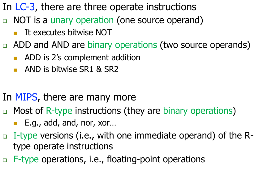 Let’s examine Operate Instructions in more detail, considering examples in LC-3 and MIPS.