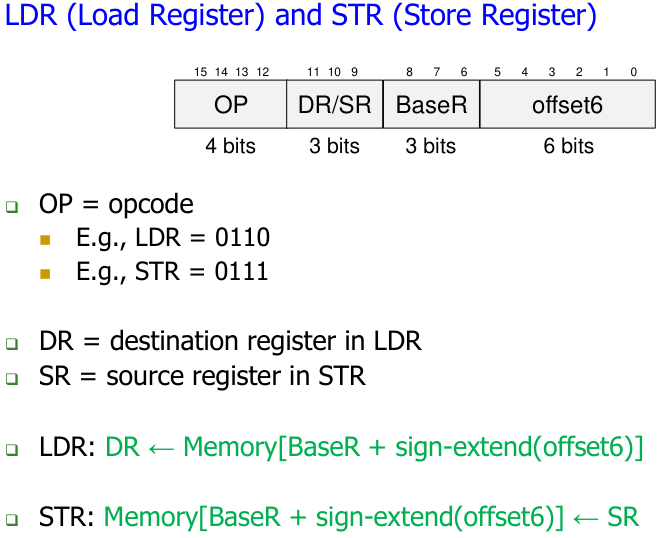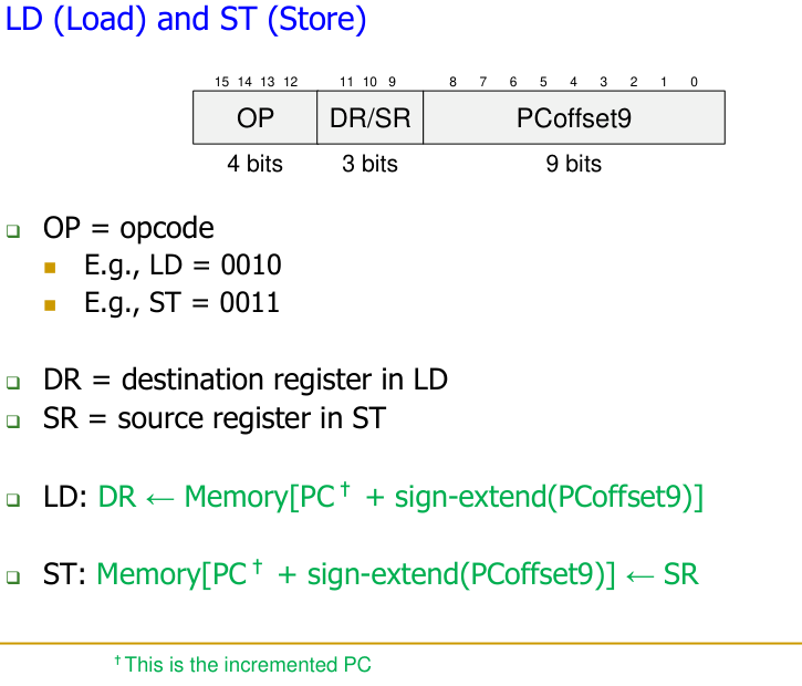 - DR or SR (bits [11:9]): Destination Register (DR) for load operations, Source Register (SR) for store operations.