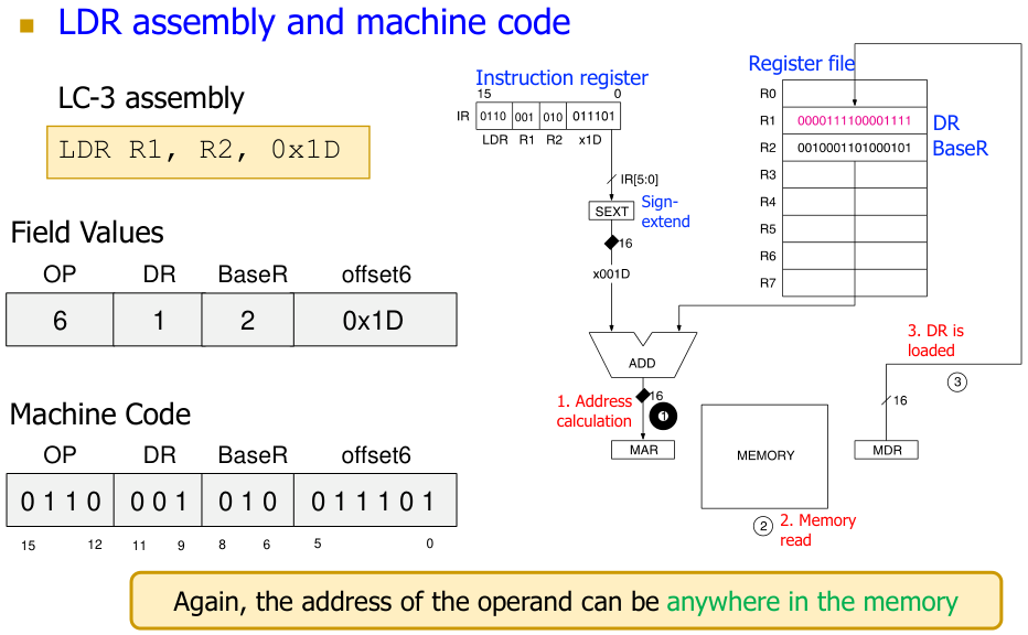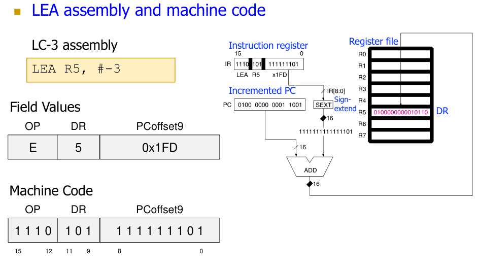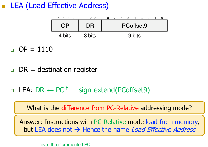 LEAcalculates a PC-relative address (PC + sign-extend(PCoffset9)) but does not access memory. Instead, it loads the calculated address value directly into the destination register. - Purpose: