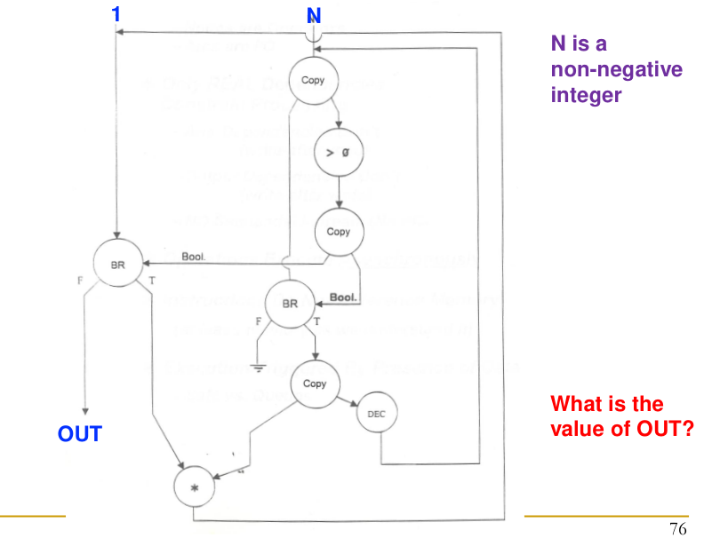 A simple dataflow program for calculating factorial is presented as an illustration. This example demonstrates how data dependencies and node firing govern program execution in a dataflow model.