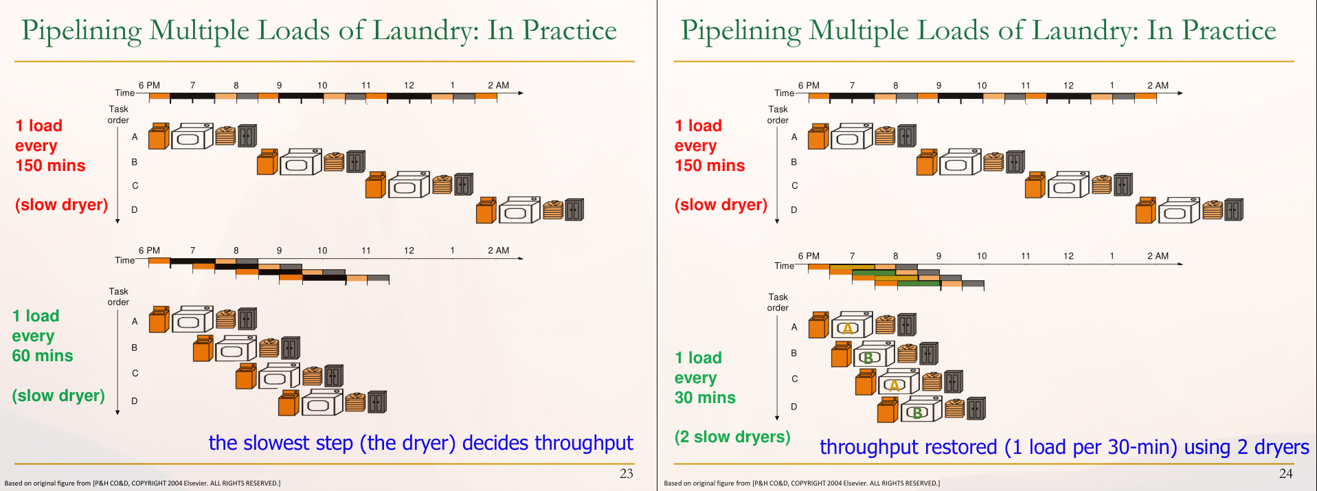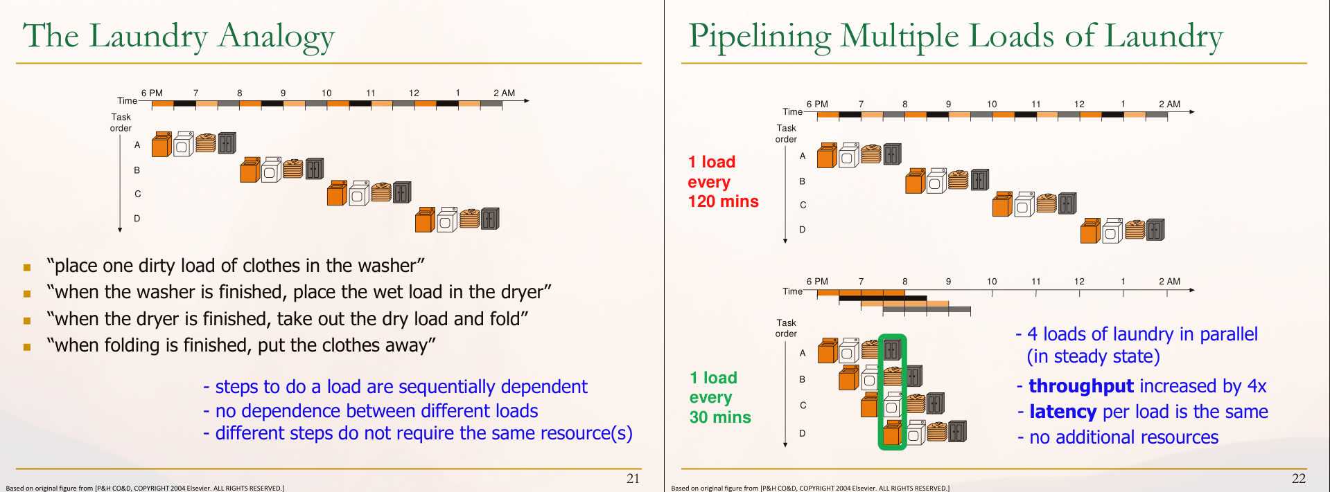 Sequential (Non-pipelined): Processing 4 loads takes 4 loads * (4 steps/load * 30 mins/step) = 8 hours. You finish one load every 2 hours.